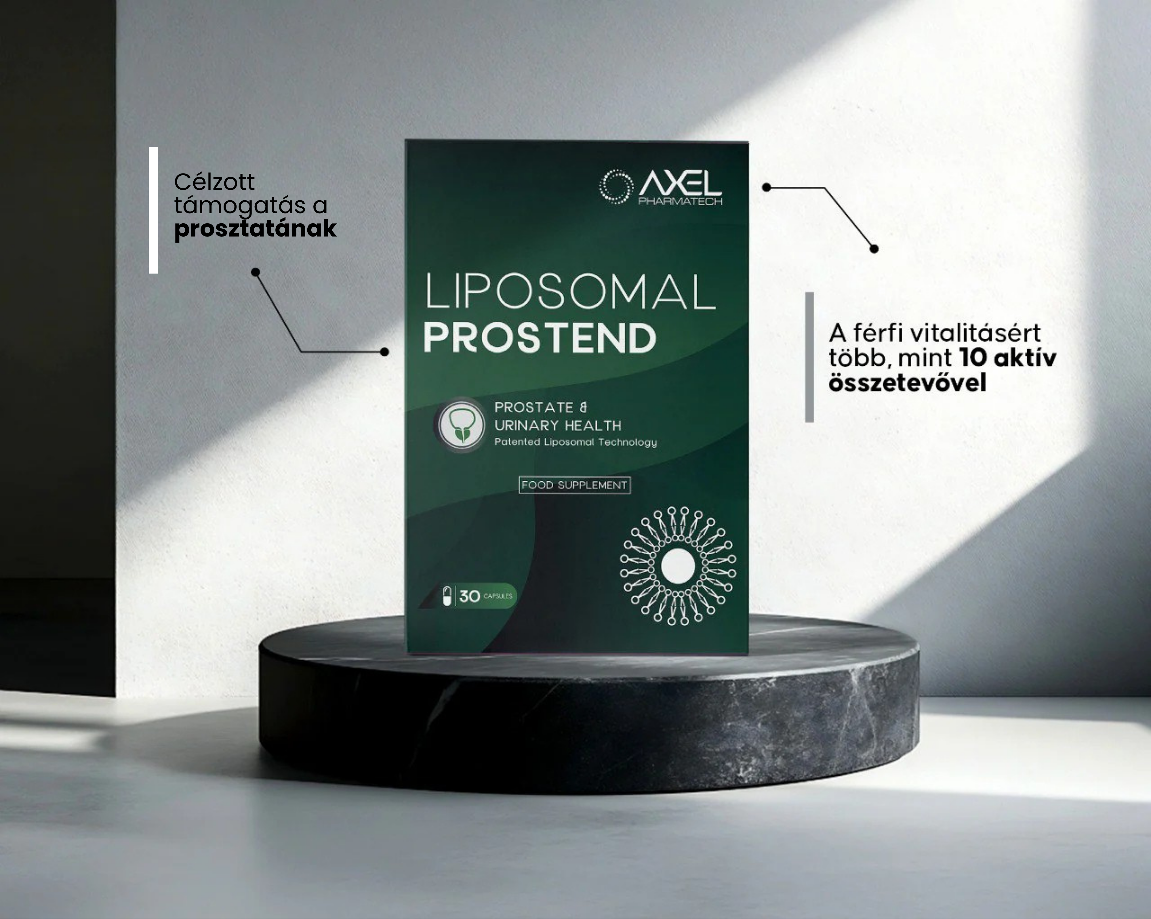 Előnyei: A kapszula 10 aktív összetevővel támogatja a férfiak egészségét és a szervezet normál működését. A Camellia sinensis segíti a prosztata egészségének megőrzését, a cink hozzájárul a normál tesztoszteronszint fenntartásához, míg a béta-fitoszterol a koleszterinszint szabályozásában játszik szerepet. A Reishi gomba és a resveratrol támogatja az immunrendszert és a szív- és érrendszer egészségét. A liposzómás technológia révén az összetevők jobban hasznosulnak, biztosítva a célzottabb hatást.